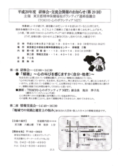 | 主催 | 東京都精神保健福祉ボランティア連絡協議会 主催者URL:http://www9.ocn.ne.jp/~kokorone/ |