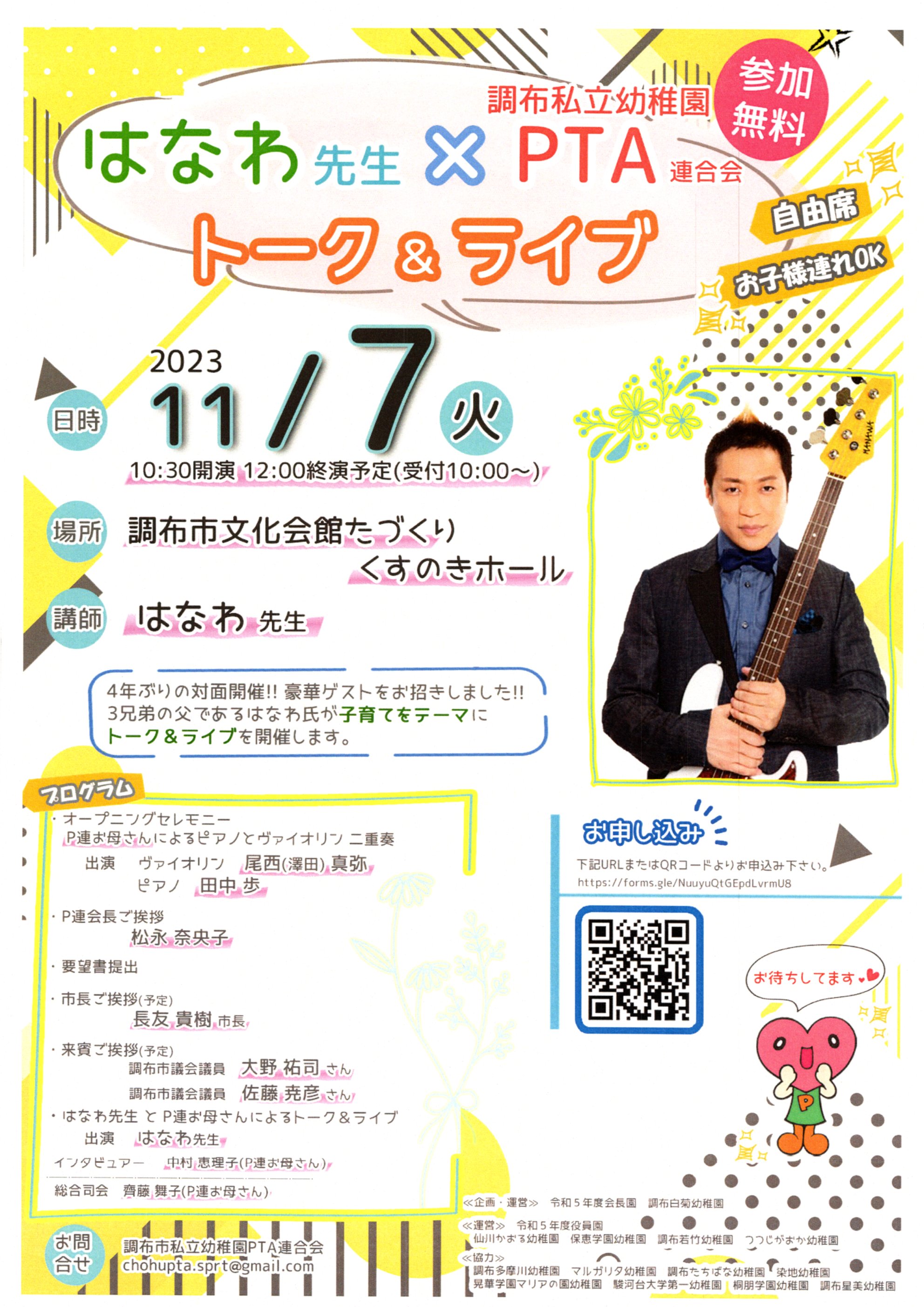 | 共催・協力等 | 《企画・運営》令和5年度会長園 調布白菊幼稚園 《運営》令和5年度役員園 仙川かおる幼稚園 保恵学園幼稚園 調布若竹幼稚園 つつじがおか幼稚園 《協力》 調布多摩川幼稚園 マルガリタ幼稚園 調布たちばな幼稚園 染地幼稚園 晃華学園マリアの園幼稚園 駿河台大学第一幼稚園 桐朋学園幼稚園 調布星美幼稚園 |