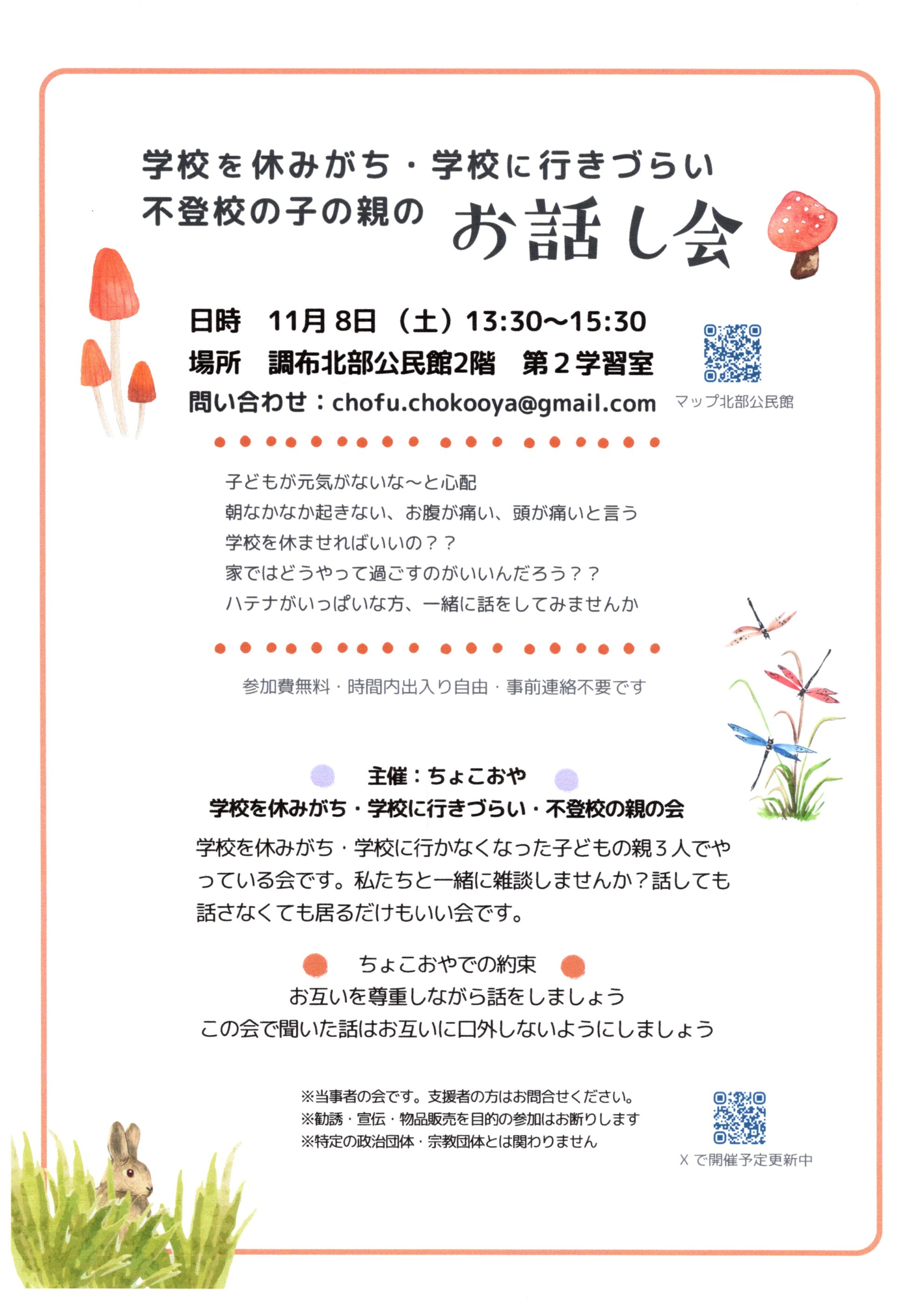 主催 | 【ちょこおや】 学校を休みがち・学校に行きづらい・不登校の親の会 学校を休みがち・学校に行かなくなった子どもの親3人でやっている会です。 私たちと一緒に雑談しませんか?話しても話さなくても居るだけでもいい会です。 |