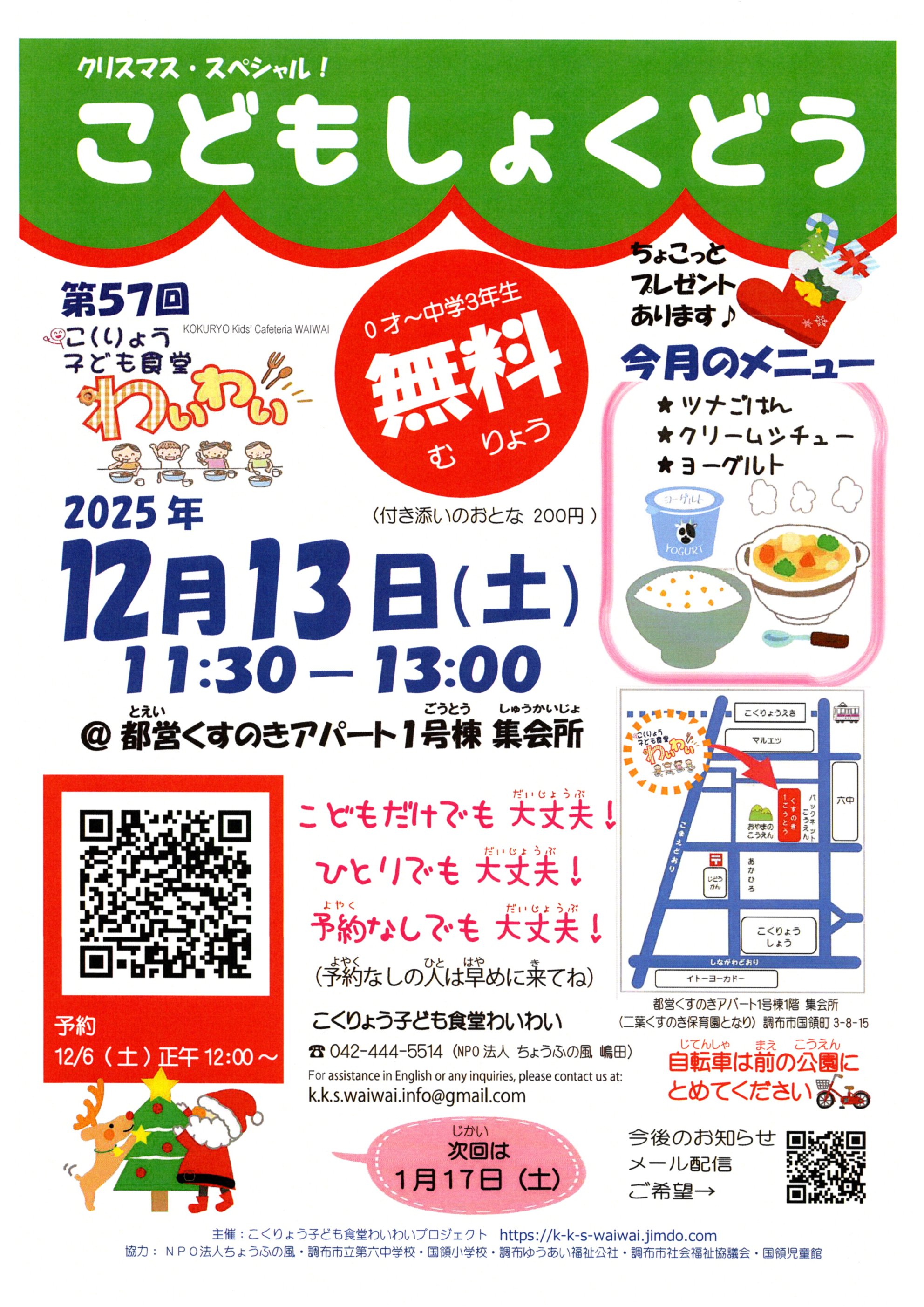 | 問合せ | こくりょう子ども食堂わいわい KOKURYO Kids' Cafeteria WAIWAI ☎ 042-444-5514(NPO法人 ちょうふの風 嶋田) For assistance in English or any inquiries, please contact us at: ✉️ |
