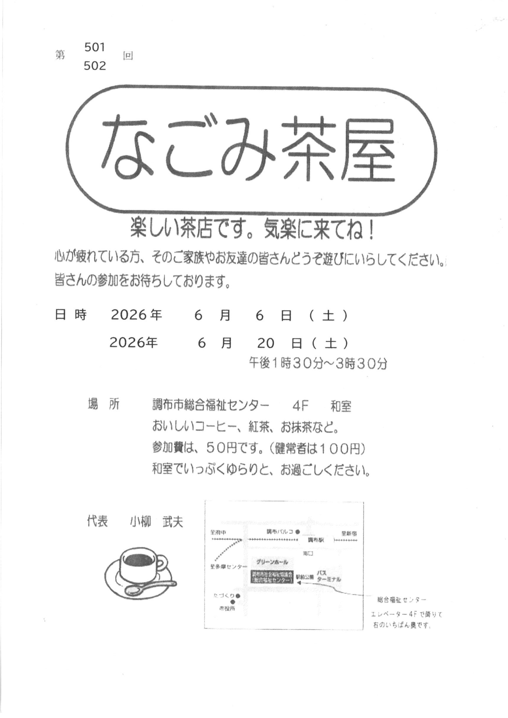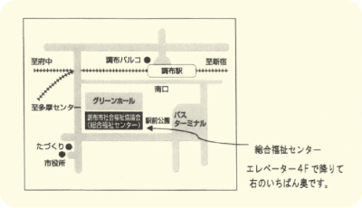 調布市総合福祉センター 4階 和室 エレベーター<4F>で降りて右のいちばん奥です。 総合福祉センター|調布市 https://www.city.chofu.lg.jp/060010/p031111.html 東京都調布市小島町2-47-1 |