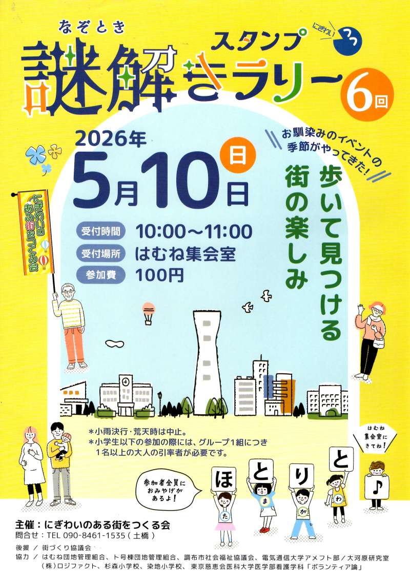 | 共催・協力等 | 後援:街づくり協議会 協力: はむね団地管理組合・ト号棟団地管理組合・調布市社会福祉協議会・電気通信大学 アメフト部/大河原研究室・(株)ロジファクト・杉森小学校・染地小学校・東京慈恵会医科大学医学部看護学科「ボランティア論」 |