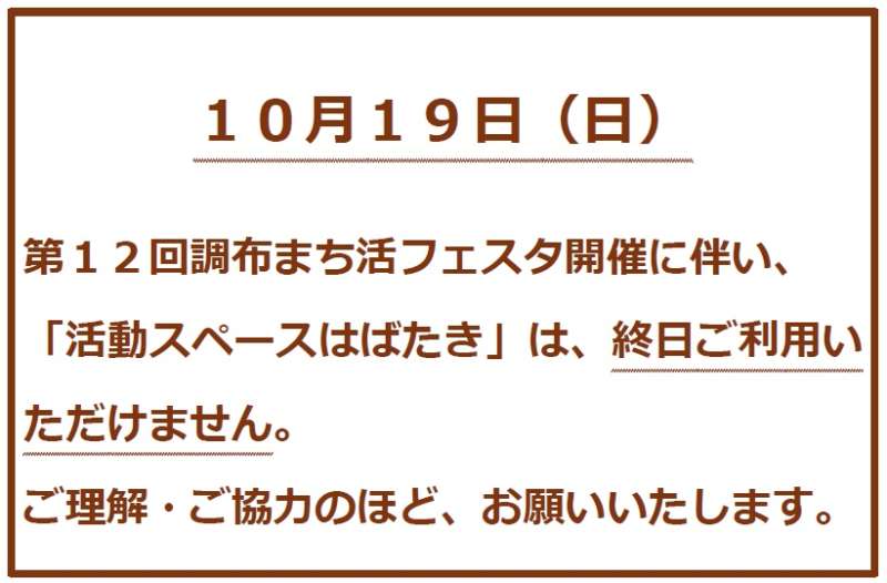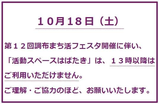 第12回調布まち活フェスタ開催のため下記、時間内は「活動スペースはばたき」が、ご利用いただけません。